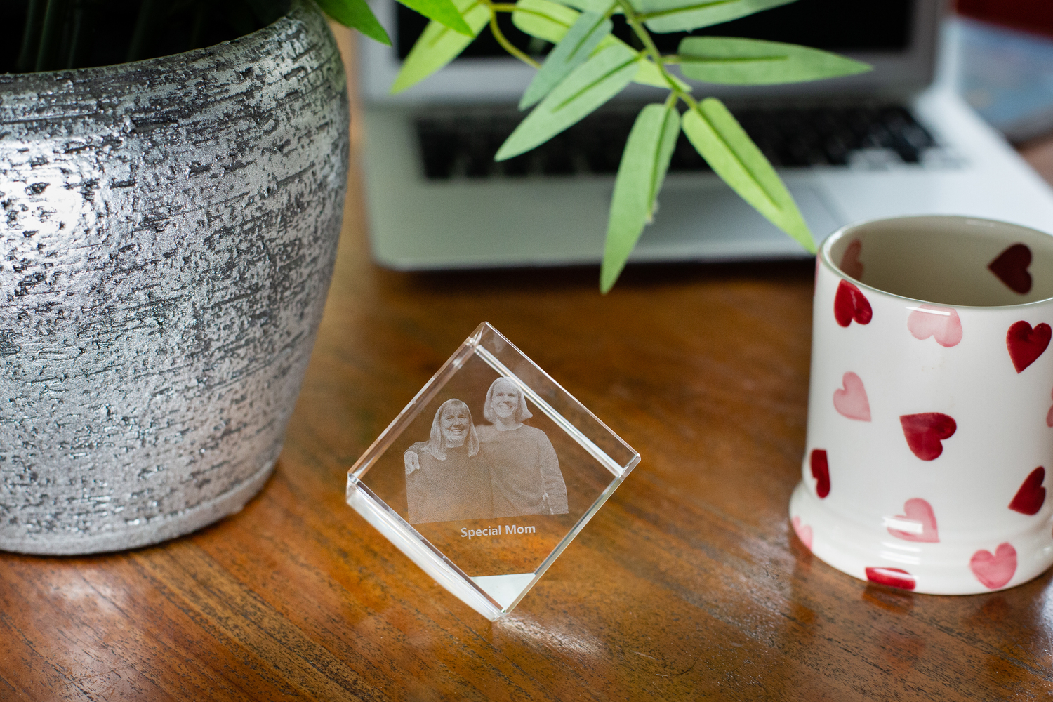 Stunning and usual cut away corner design make for a 3d glass engraving that presents like a diamond.