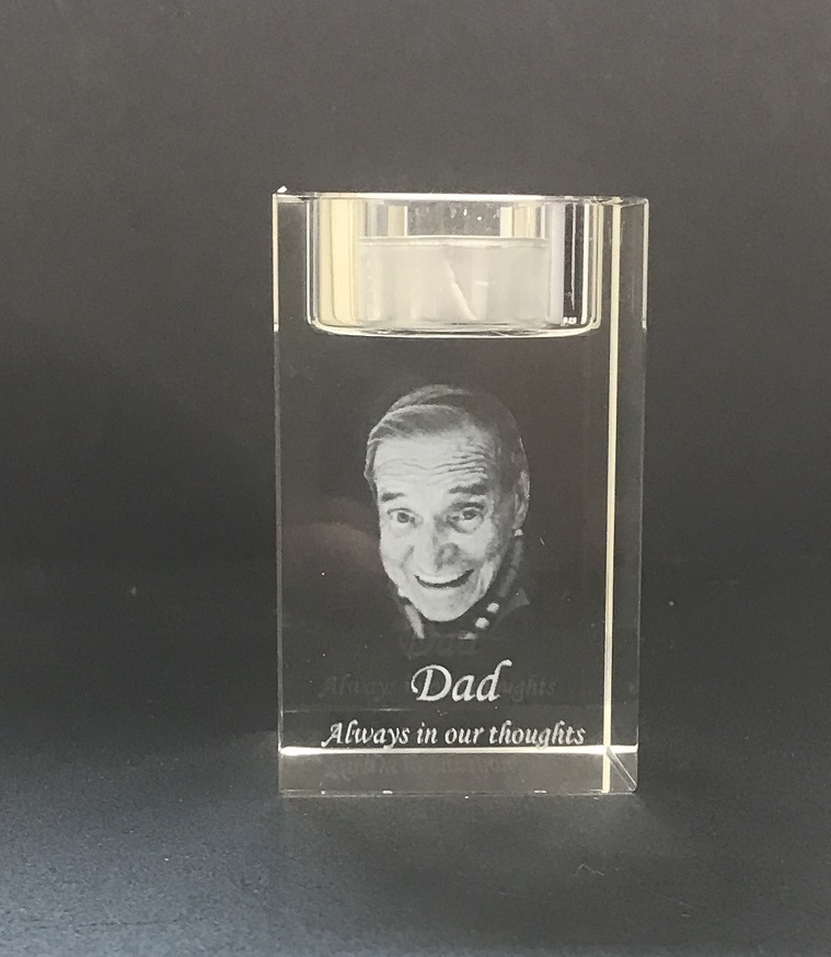 This candle holder transforms a cherished photo of a deceased loved one or pet into a beautiful three dimensional photo to remember and celebrate their life.