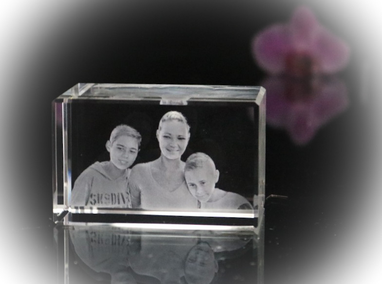 A beautiful 50 x 50 x 80mm 3D photo Crystal in Landscape, image showing 2-3 persons laser engraved. Includes Gift box.
